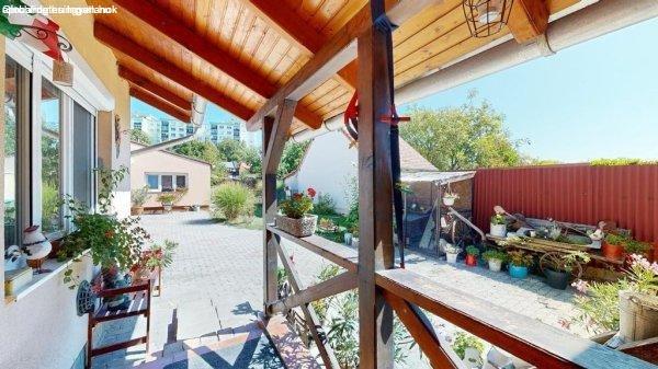 házat, 993 nm-es összközműves, részben parkosított részben térkövezett udvarral.