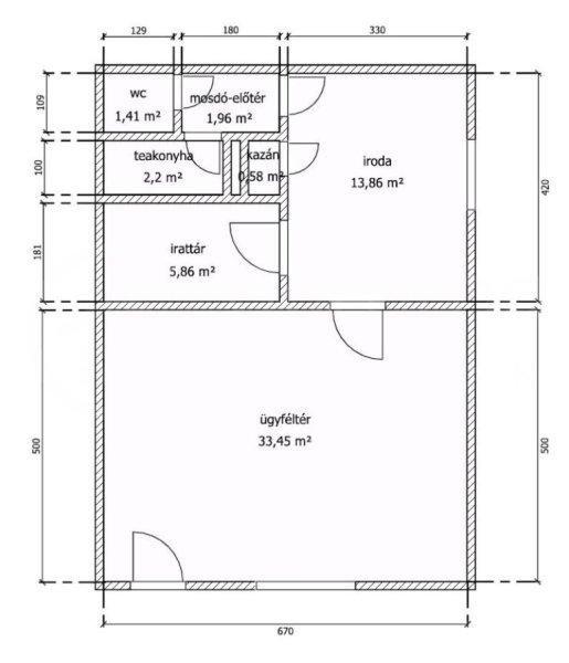 csempézettek, a padló burkolat kerámia lap.Helyiséglista:- Ügyféltér- Iroda-