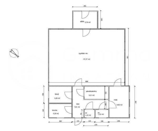 lista:- Előtér- Ügyféltér- Közlekedő- Tároló- Konyha- 2db WC.- Iroda-