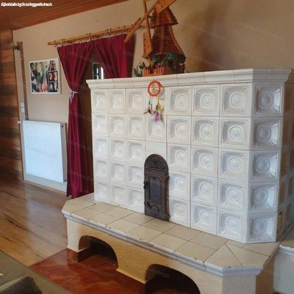 kiépített cserépkályhát a nappaliban ami még a ház extra fűtési lehetőségét