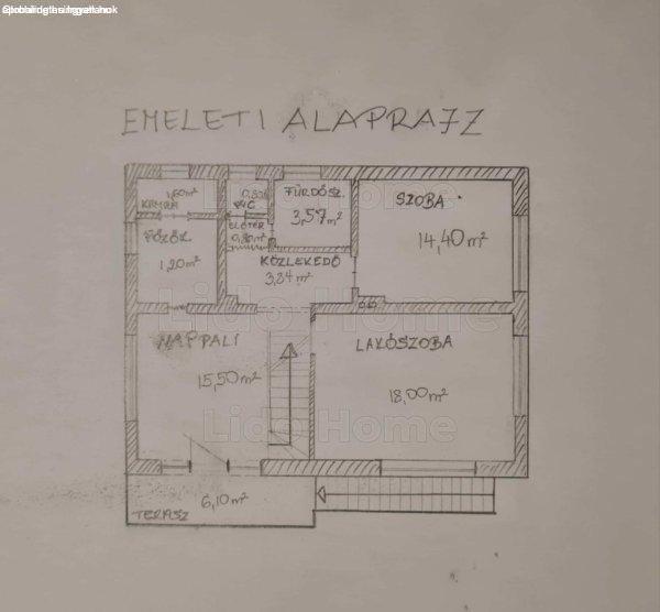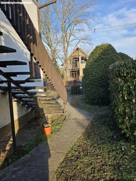közlekedő és padlásrész is.Az emeletre a ház falán kívül elhelyezett kényelmes