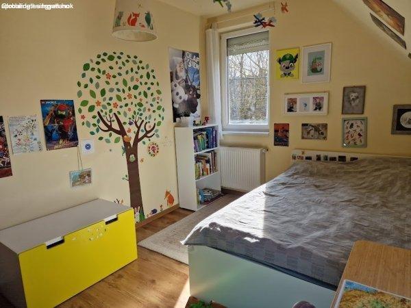 csendes, világos, kétszintes, 96 nm-es 4+1 félszobás ,kertes ikerház fél.Az