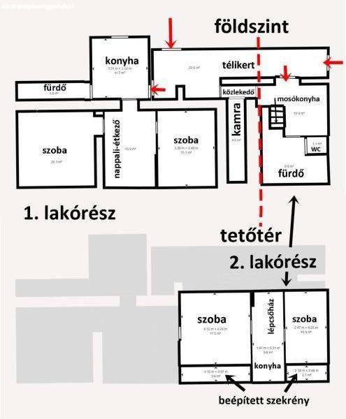 szobás, 69 m2-es 1. lakórészt találunk, valamint egy földszint + tetőtér