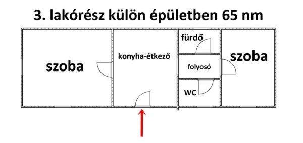 kialakítású 60 m2-es, 2 szobás 2. lakórészt. A másik különálló épületben egy 65