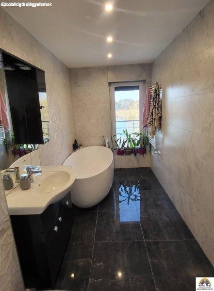 fürdőszoba az egyik zuhanyzós a másik szabadon álló kádas. Található még ezen