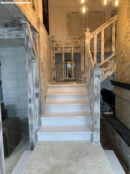 közepén egy impozáns kandalló található, mely az egész házat befűti a téli
