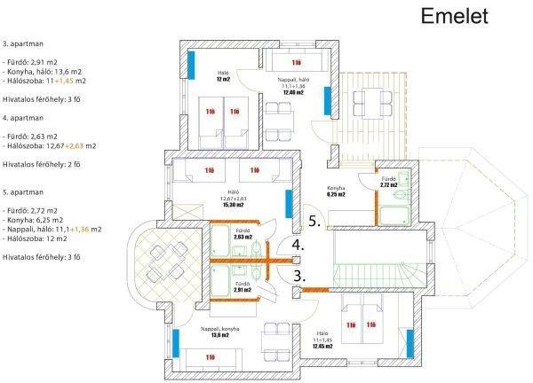került két különálló apartman (2 szoba, konyha, fürdőszoba), az emeleten 3