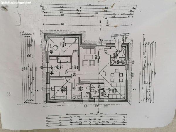 megvan. A ház elosztása: Nappali, étkező,30,85 m2, konyha 6,78 m2, spájz, 1,32