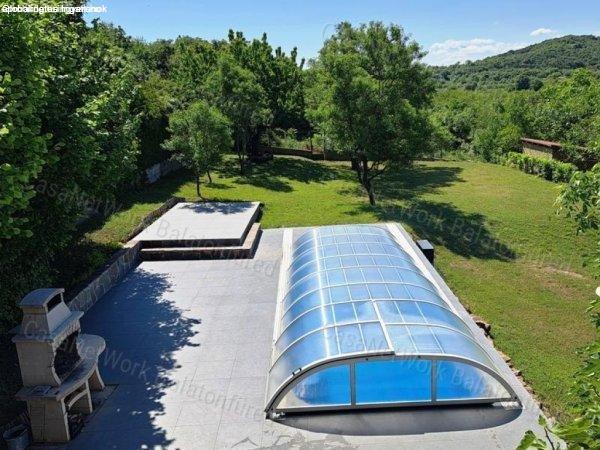 történhet - egy 8 x 3 m kb. 1,5 m mély fűthető , fedhető medence is található a