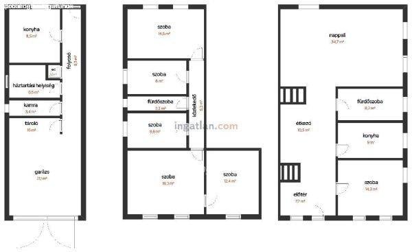 garázs, mosókonyha, wc, konyha és spájz található, míg az emelt szinten egy
