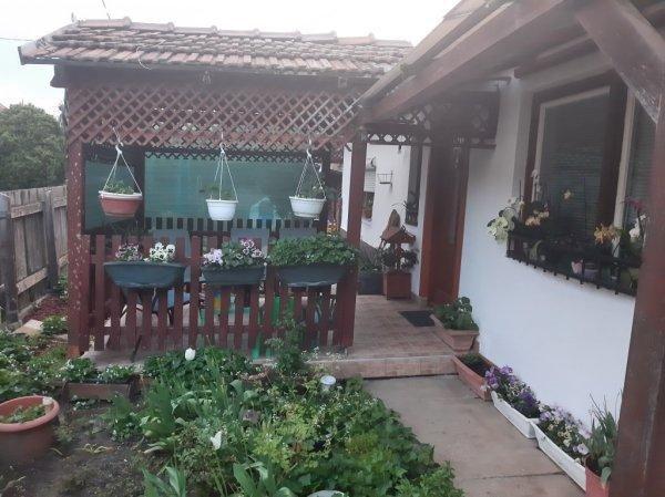 kétgenerációs ingatlan kicsi gondozott telekkel, fedett kocsibeállóval.Az