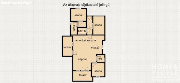 konyhás nappali, 2 db hálószoba, wc/háztartási helyiség, fürdőszoba,