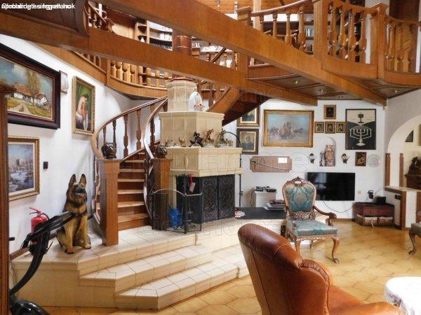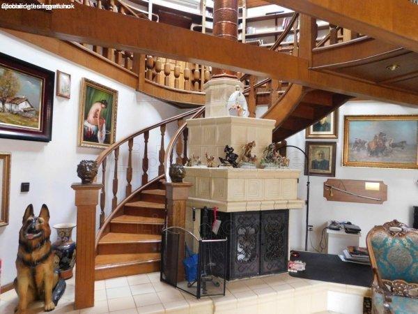 kandallóval és könyvtárgalériával, étkező-konyha, spájz, előszoba, rendelő vagy