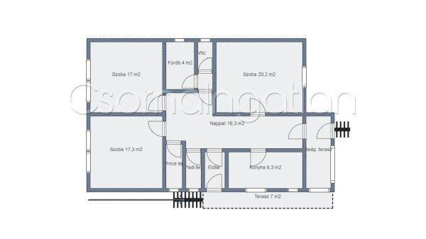 eladó.HELYISÉGEKFöldszint- 3 külön bejáratú szoba (17 m2, 17,3 m2, 20,2 m2)-