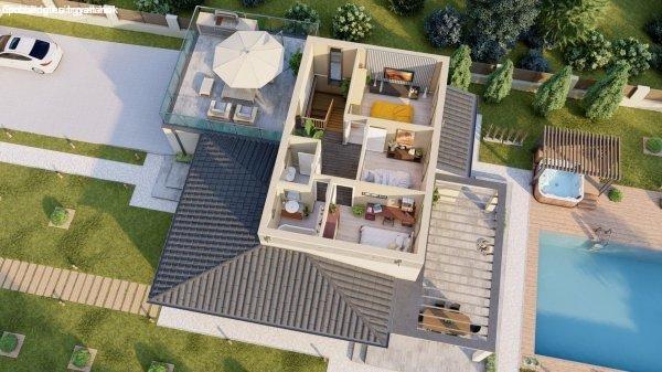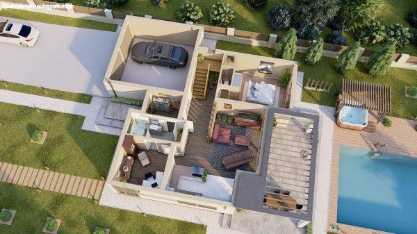 nappali + 5 szobás , valamint 56 m2-es terasz tartozik hozzá és 36 m2-es garázs