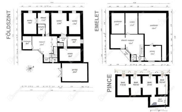 emeleten összesen 232 m2 nettó hasznos területen 9 szoba - egy 32 m2-es garázs,