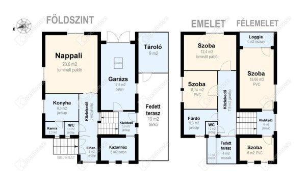 előszoba, közlekedő - a félemeleten 2 szoba és egy loggia - az emeleten 2 szoba,