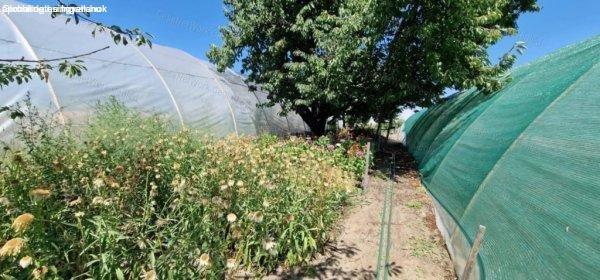 kert rendezett és termő, rajta négy fóliasátor kapott helyet: kettő eperrel, egy