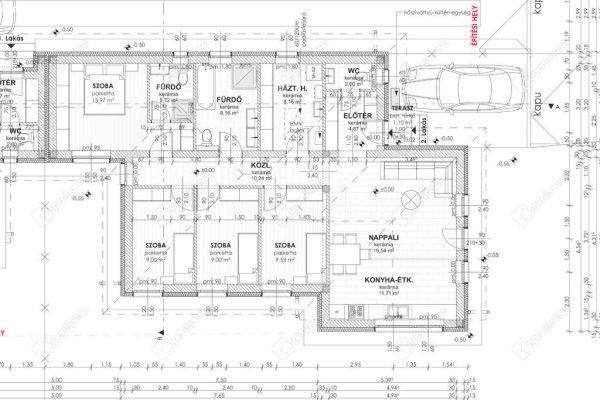 nappali-konyha-étkezővel, két fürdőszobával, három WC-vel és háztartási