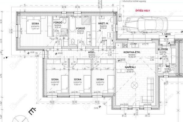 nappali-konyha-étkezővel, két fürdőszobával, három WC-vel és háztartási