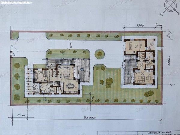 184 m2 és egy 92 m2-es vendégház- belső elosztása: előszoba, 4 szoba, 2