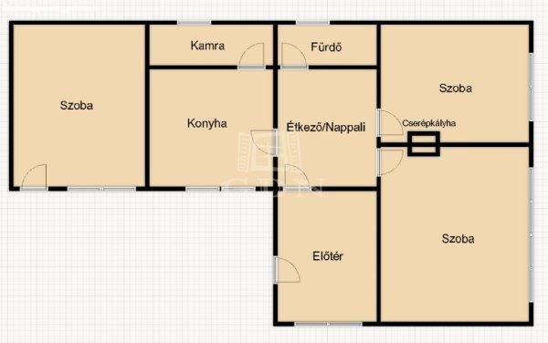 ÁTALAKÍTHATÓ. A fűtést egy hagyományos cserépkályha biztosítja, a közművek pedig
