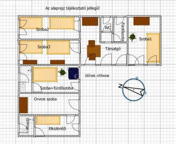 idősotthon (117 m˛): Beltéri kialakítás:? 3 különálló szoba (1 ágyas, 2 ágyas, 3