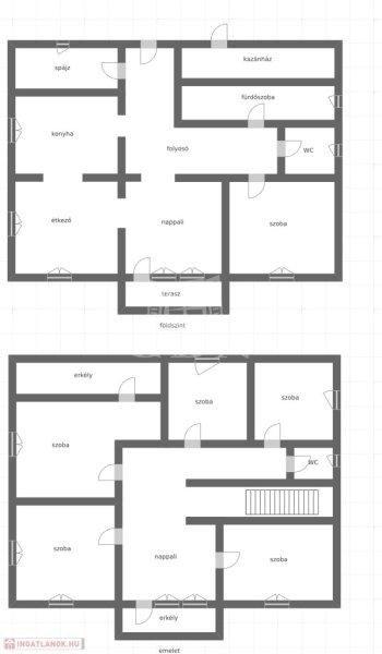 nappali, fürdőszoba, illemhely,- emelet: nappali, négy hálószoba, az ötödik