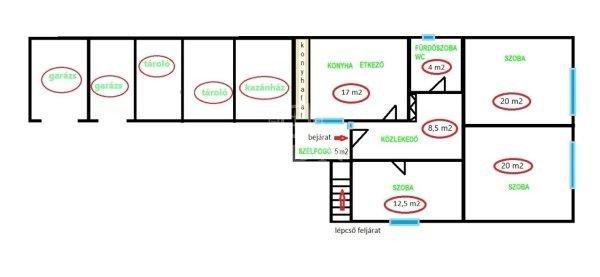 közlekedő, 3 szoba, konyha-étkező: 82 m2Új tető alatt melléképületek sora: + 80