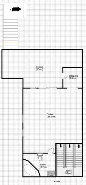 nyílik a Dunára.Földszinten található egy második fürdő zuhanyzóval, ezen a