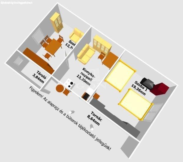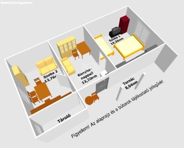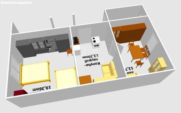 alapterülete 45,36nm, melyben található:- 2 szoba,- konyha-nappali,- tornác,-