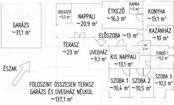 fél szoba Földszint: nappali, konyha, étkező, 1 dolgozószoba, 3 hálószoba, külön