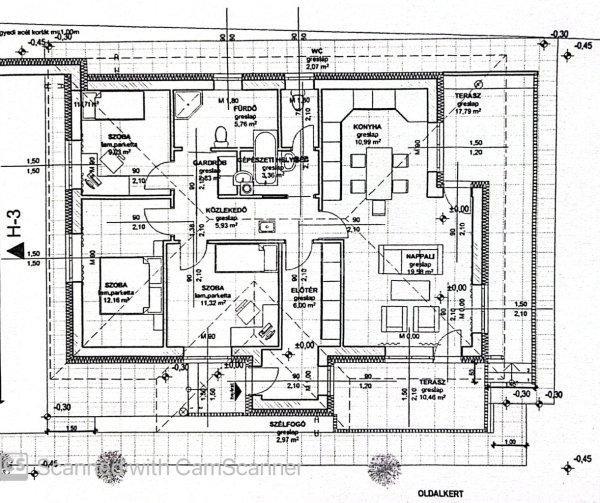 nappali, 3 külön nyíló szoba (11, 12 és 9 nm) egy gardrób, egy háztartási