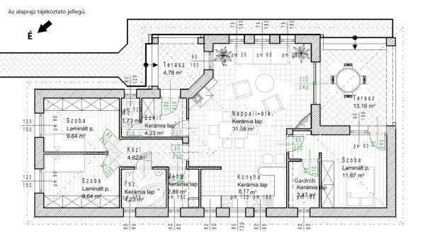 ház praktikus elrendezésű: tágas amerikai konyhás nappali, három hálószoba,