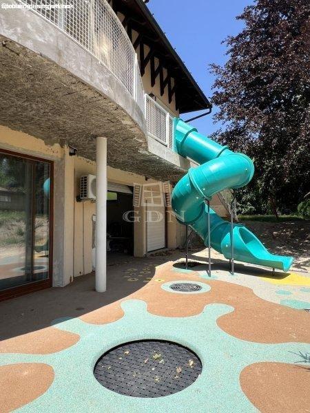+ tárolók + zuhanyzó + wc + műhely + pince), saját játszótérrel, kerti