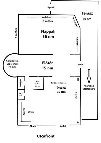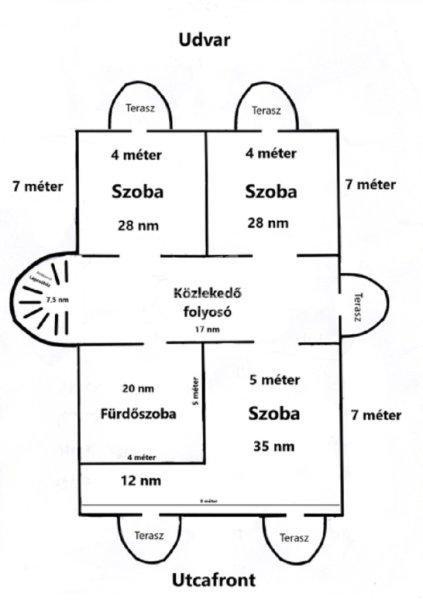 káddal 20 m2, közlekedő és lépcsőház . Minden emeleti szobához terasz ,az utcára