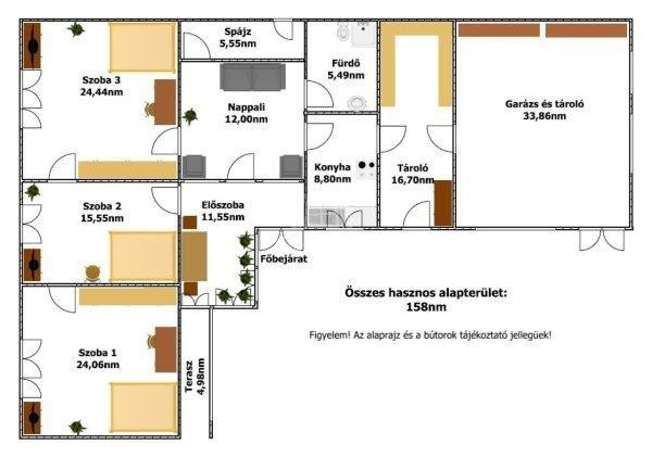 található:- 3 szoba,- fürdőszoba,- nappali,- konyha,- spájz,- tároló,-