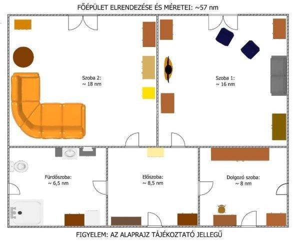 található:- 2 db nagyszoba,- dolgozószoba,- előszoba,- fürdőszoba.A második