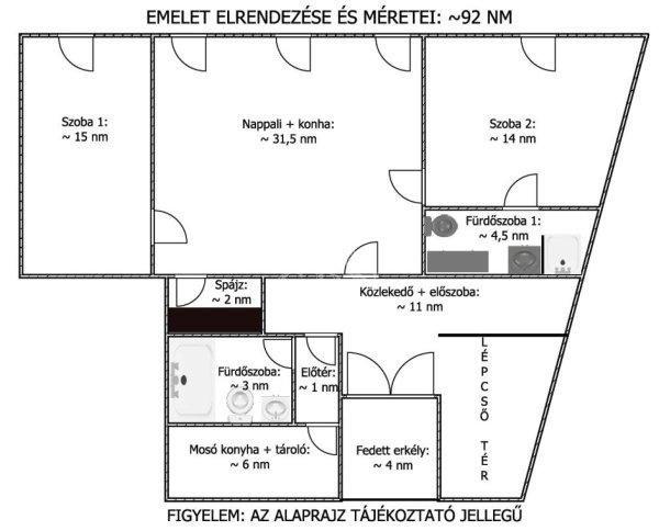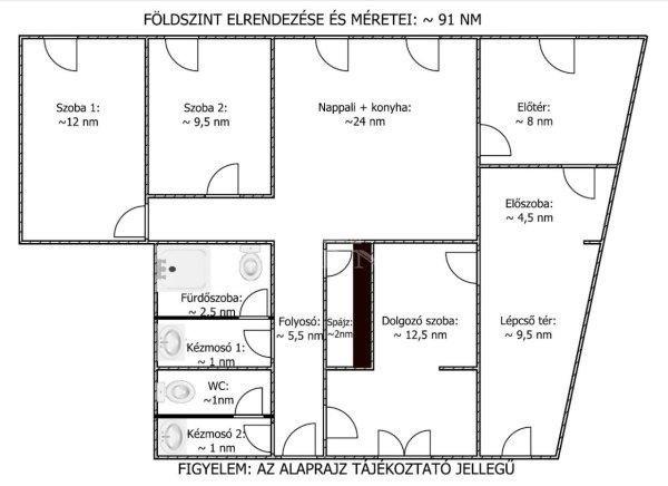 nm melyben található:- Földszinten: előtér, mosdó+WC, fürdőszoba, folyosó,