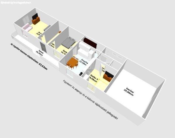 melyben található:- 4 szoba,- fürdőszoba,- konyha + nappali- spájz,- előszoba-