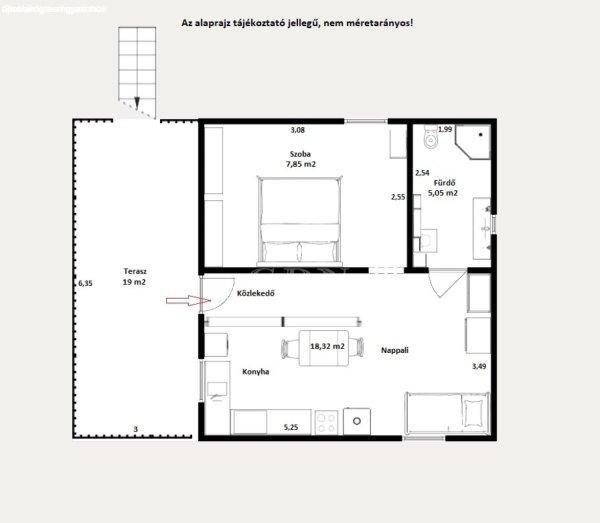 étkező-nappali, - 7,85 m˛ hálószoba, - 5,05 m˛ zuhanyzós WC-s