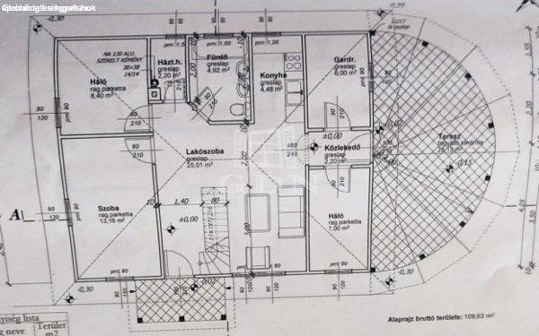 25,01 nm.Emelet:- előtér 19,90 nm,- fürdőszoba + WC 7,60 nm,- szoba 10,40 nm,-