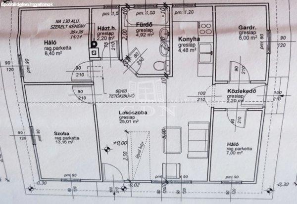 háztartási helyiség 2,20 nm,- konyha 4,48 nm,- közlekedő 2,20 nm,- lakószoba