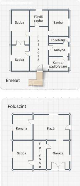 osztva, a földszinten található egy garázs, kazánház, szoba és a konyha. Az