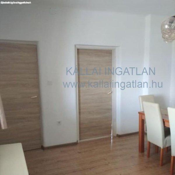 konyha járólappal, a szobák laminált parkettával vannak burkolva. Fürdő-WC egy