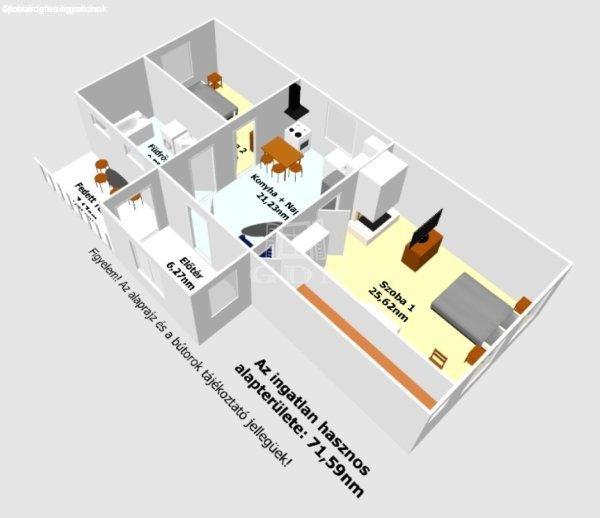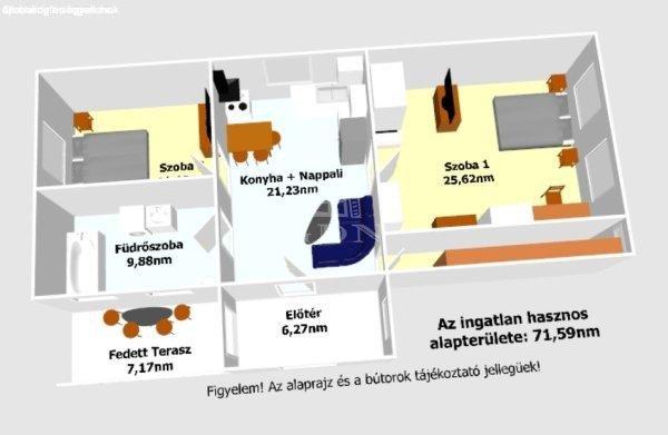 ház alapterülete: 117nm.Az épület hasznos alapterülete 71,59nm melyben