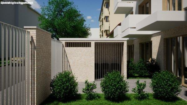földszinten 1 lakás dupla kerttel, tárolók, valamint biciklitárolók helyezkednek