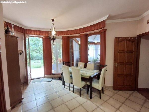 parkosított, gondozott telken lévő, két szintes, egyedi tervezésű, nagy, árnyas