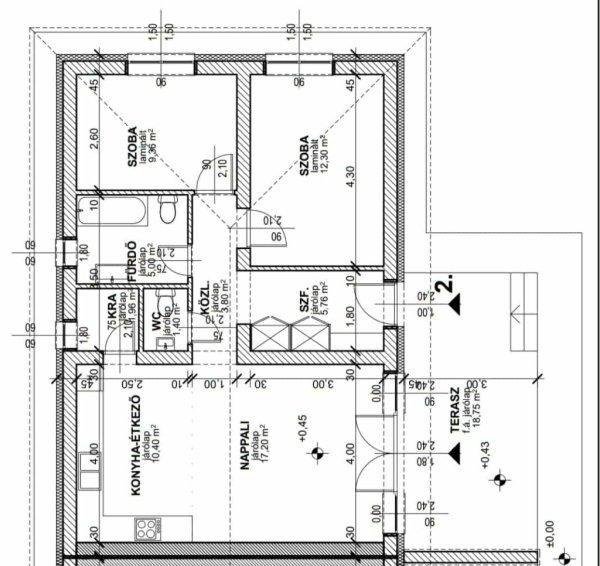 fürdőszoba kádas- külön wc- kamra- külön nyíló szobák (9,36 m2, 12,90 m2 )-