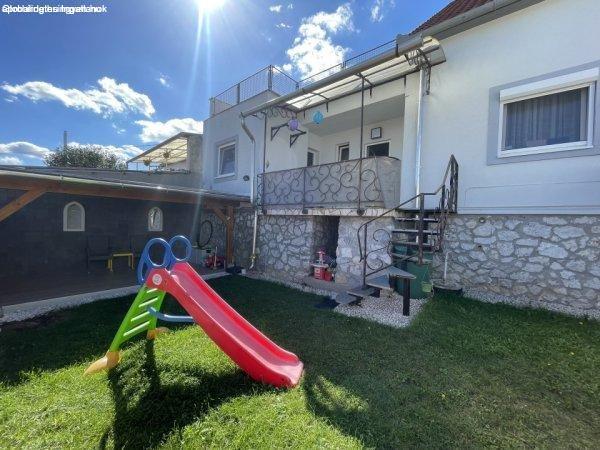 dupla garázsos családi ház, sok tárolási lehetőséggel, pihenő udvarral.A